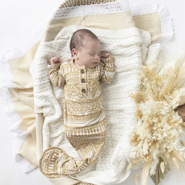 Introducing Kai, the darling organic bamboo knotted gown that’s sure to make your little one stand out from the crowd! The exclusive print, with its soft earthy hue, is hand-drawn and painted by Kute Cuddles, adding a touch of playful uniqueness.