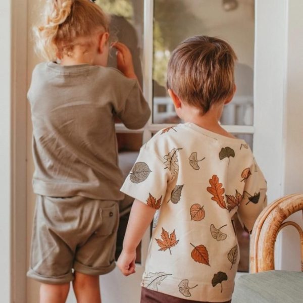 Explore the essence of nature with our leaf patterned short-sleeve T-shirt, a garment that brings the outdoors into your little one’s wardrobe with a touch of elegance and uniqueness. Featuring a deliberately designed leaf print, every shirt has its own unique print placement, making each piece a one-of-a-kind addition to your child’s collection.